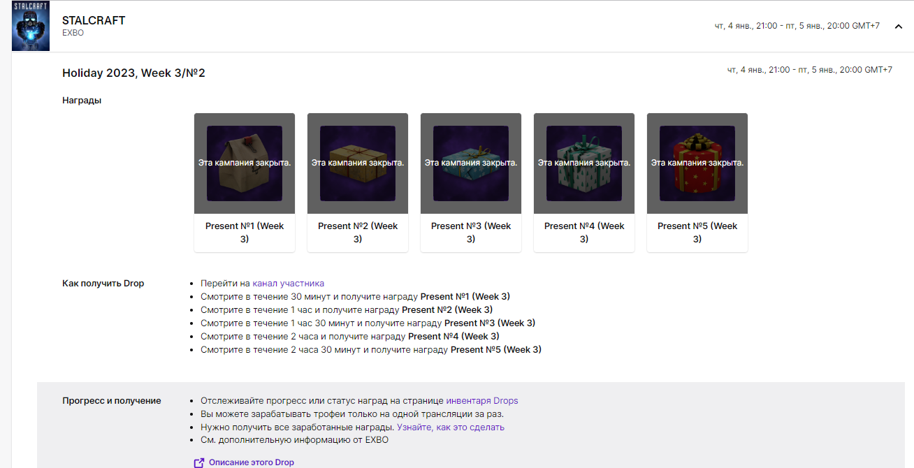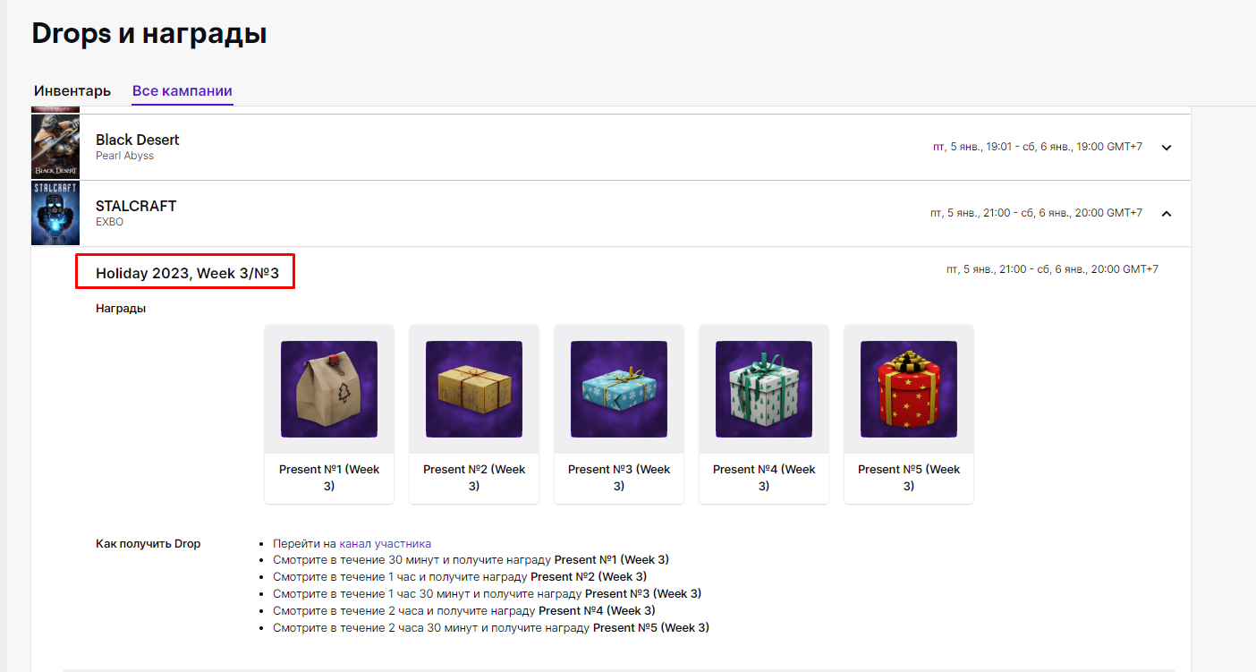 4 - Если вы уже получали какие-либо дропы любой кампании, например, сначала купили 1 неделю подарков, а затем купили аккаунт на котором есть и 1 и 2 и 3 недели дропов, то вы получите только те кампании/недели что не получали ранее, т.е. 2 и 3