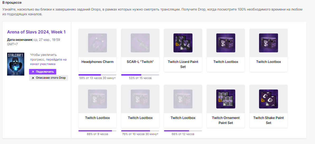 Подключать можно также аккаунт на котором еще не зафармлены все предметы, при условии что раздача все еще идет. В таком случае предметы буду поступать к курьеру по мере получения в инвентарь Twitch. С такого аккаунта ничего смотреть не нужно.
