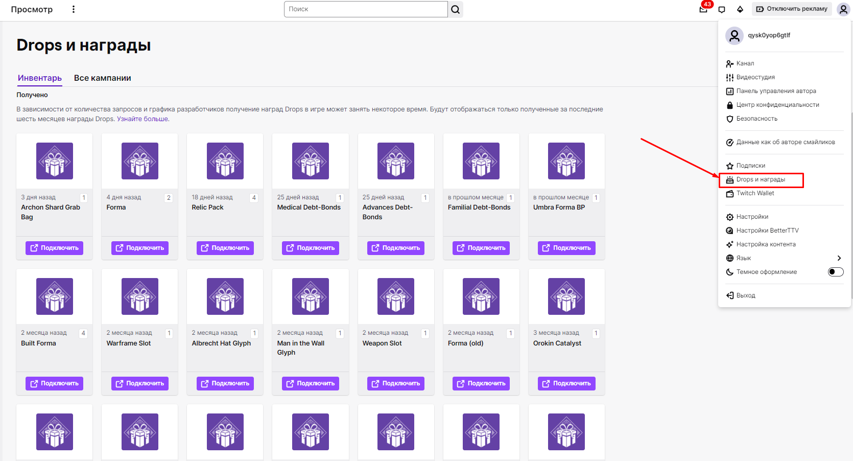 Обратите внимание, предметы полученные более 6 месяцев назад не отображаются в инвентаре твича, но они есть. Это также указано в сообщении о полученных наградах на самом сайте.