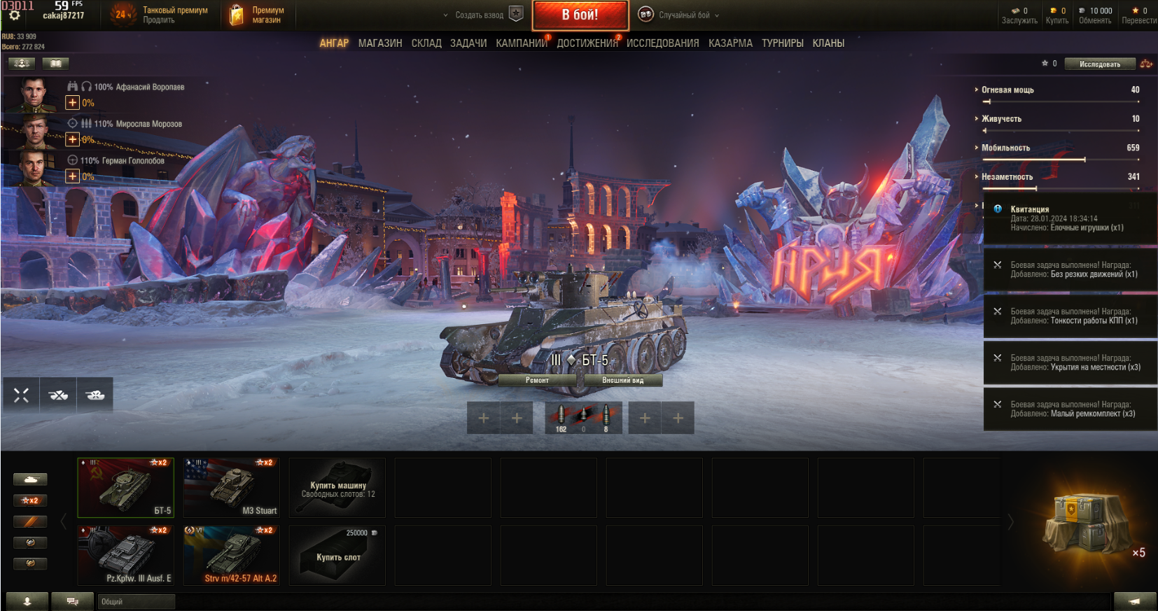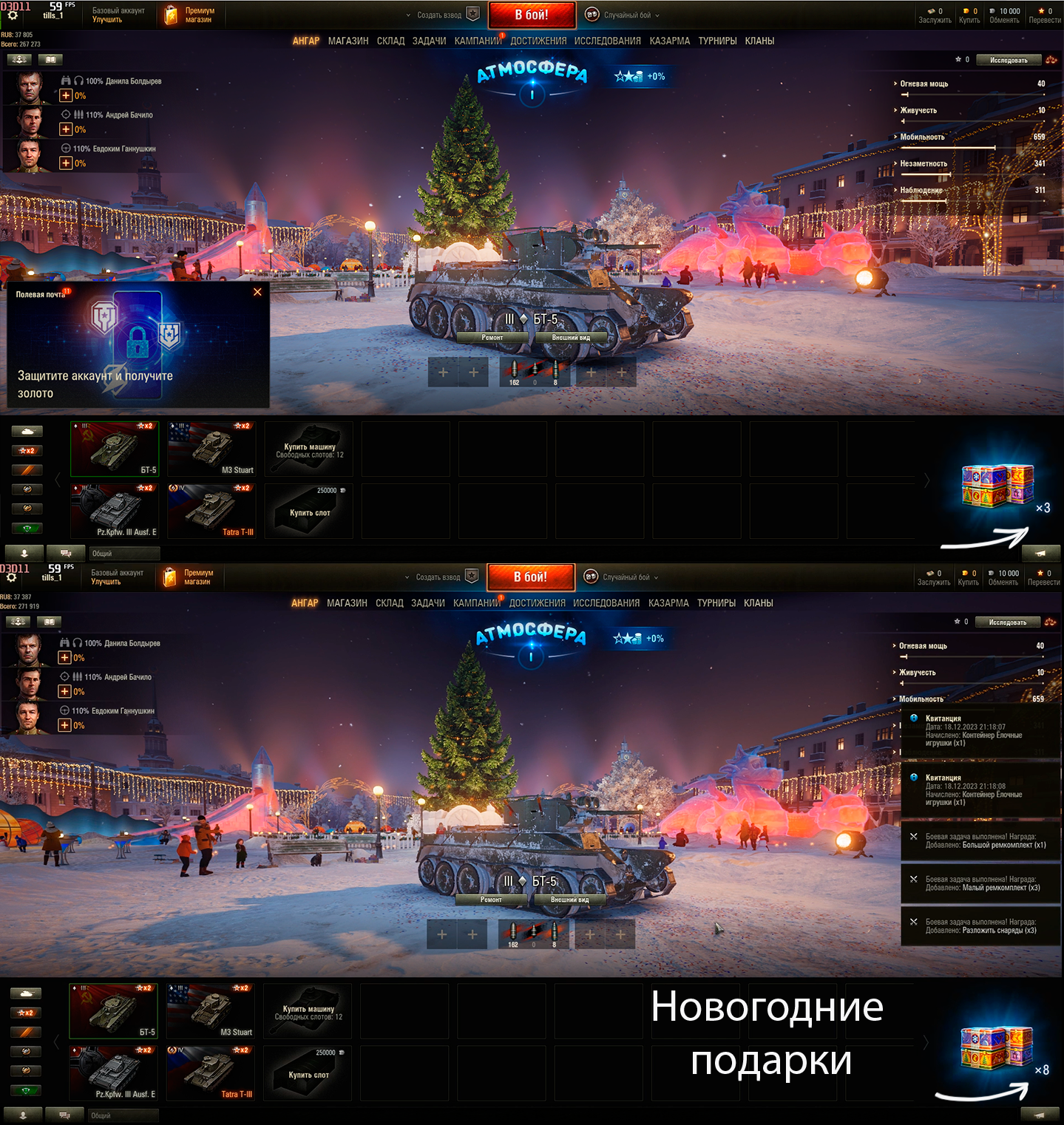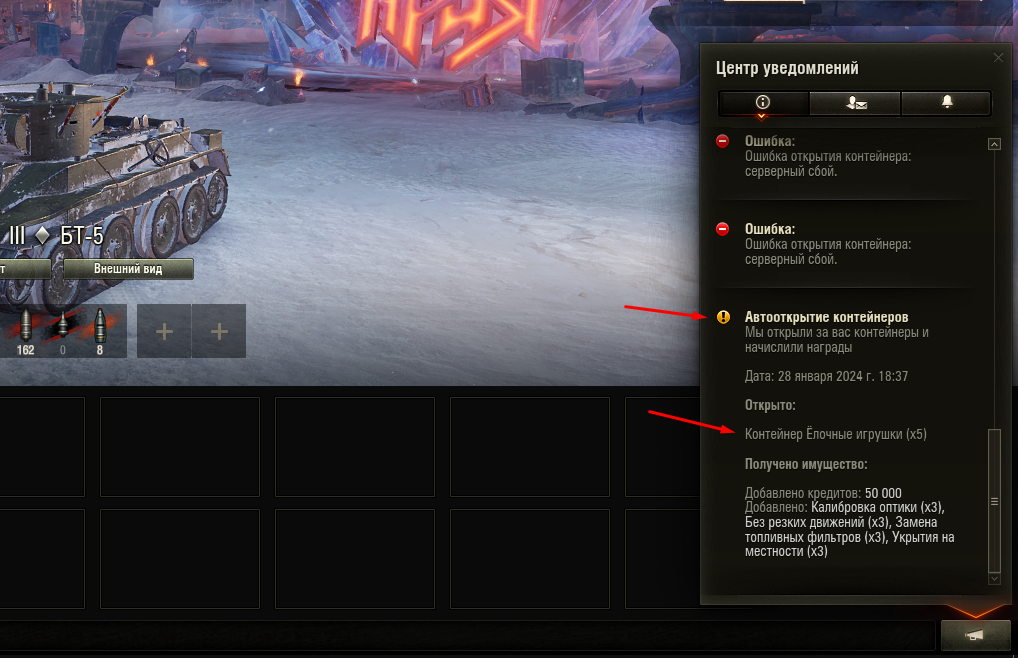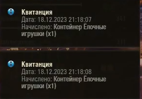 Ниже пример активации контейнеров - Новогодних подарков. Пришли  уведомления (Выполненные боевые задачи с наградами) уведомления + 5 ящиков.